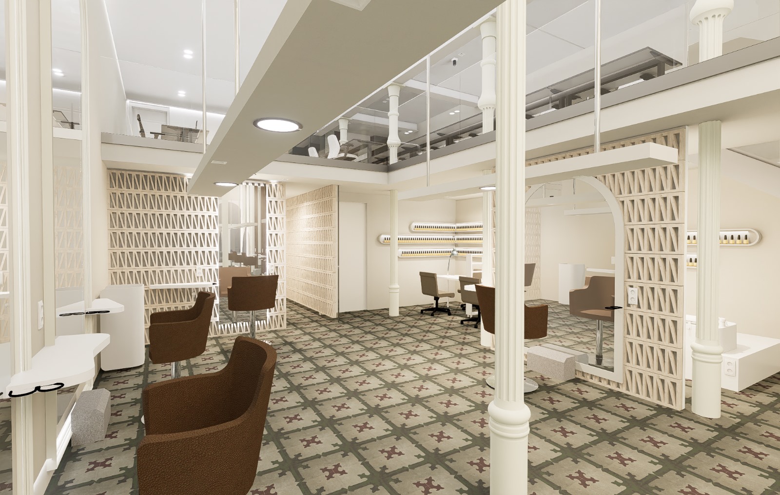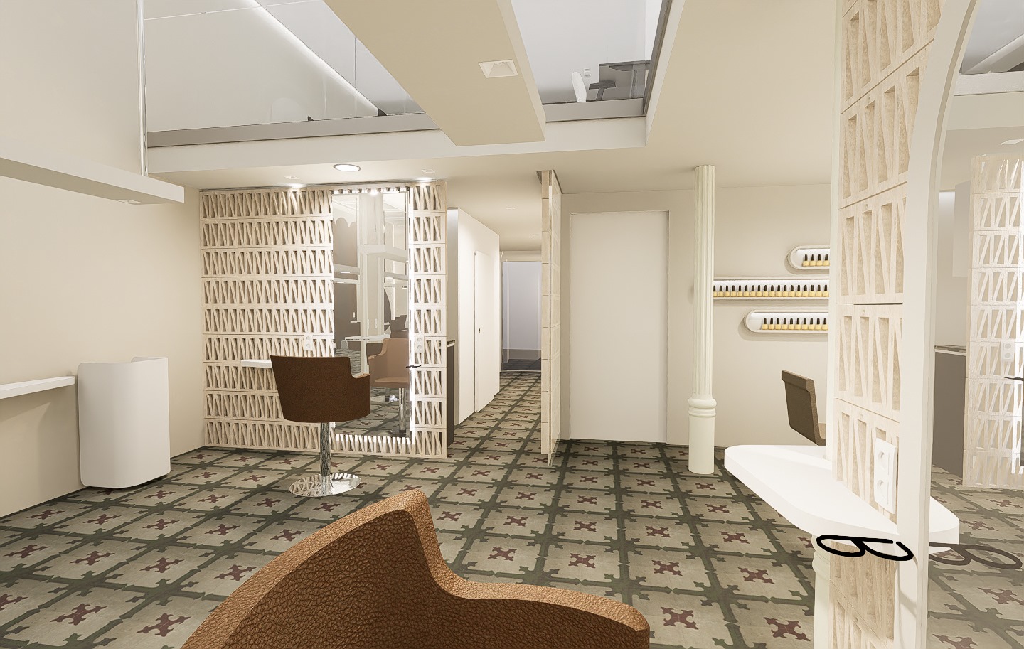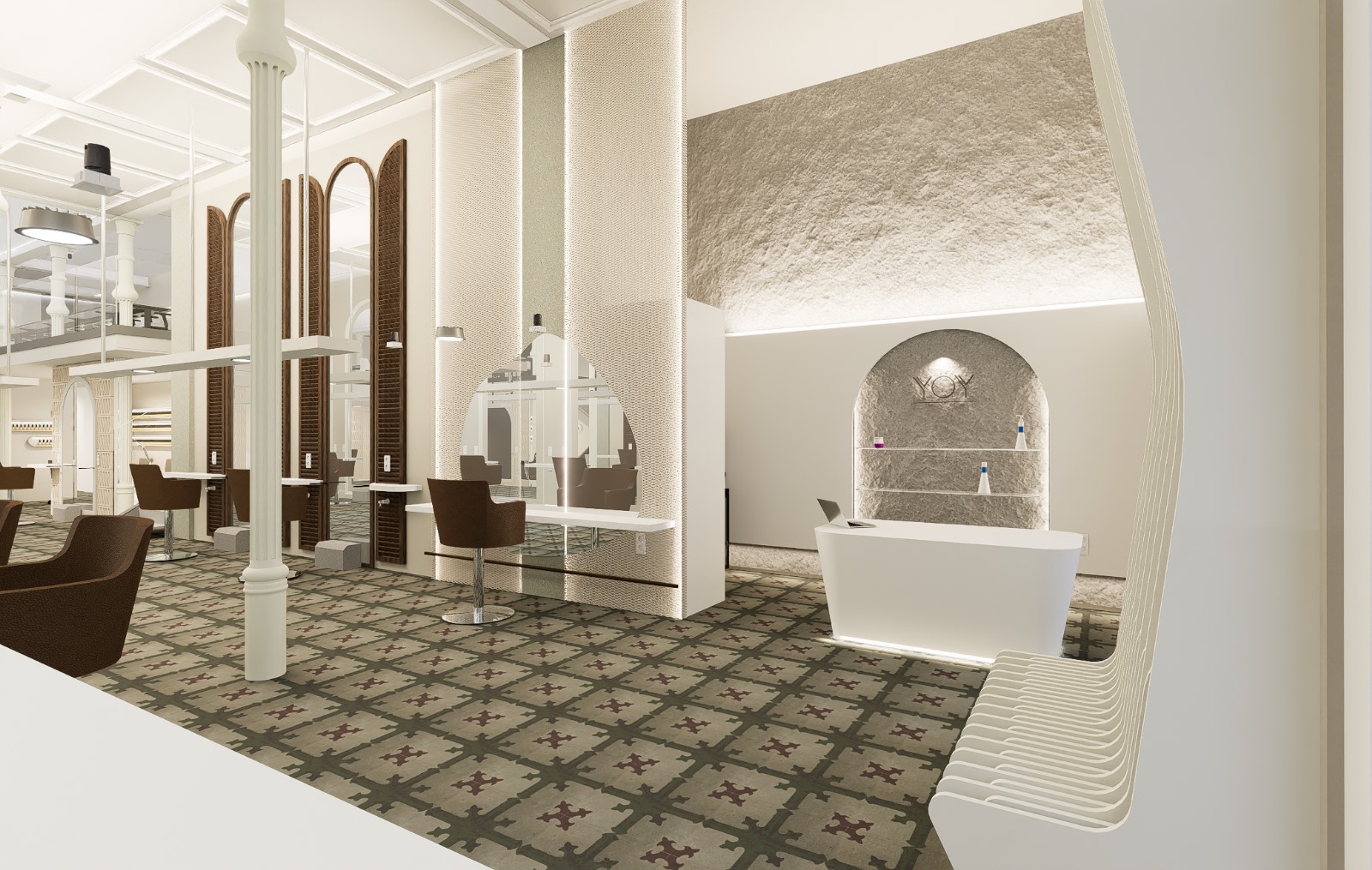 Renders 3D de la reforma de la nueva peluquería de lujo YÖY en el centro de Madrid.