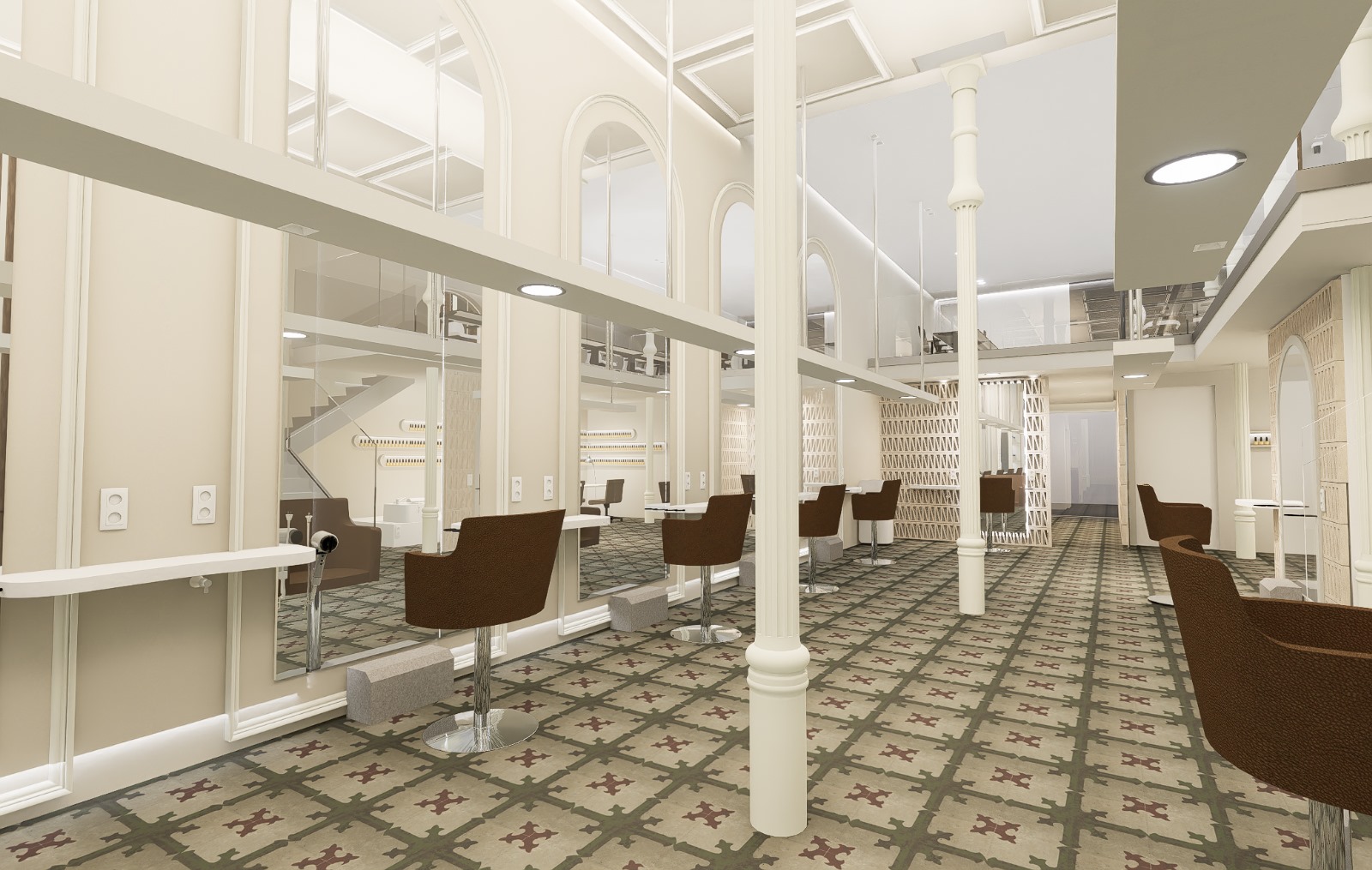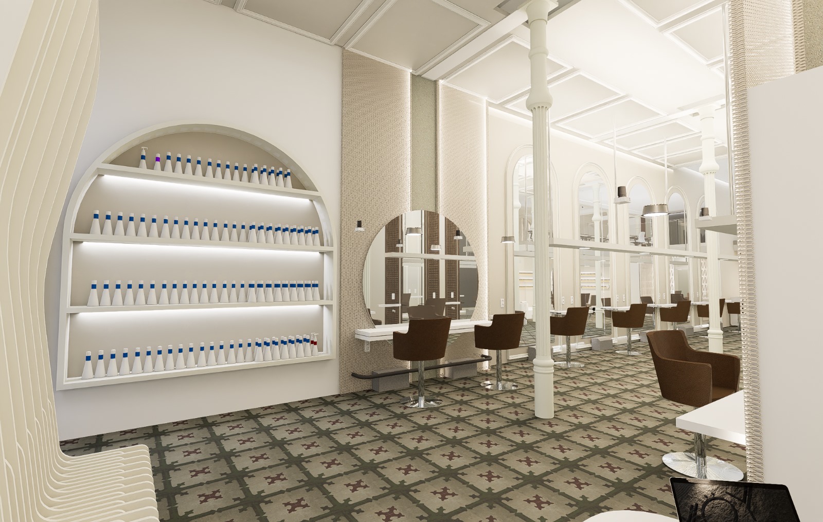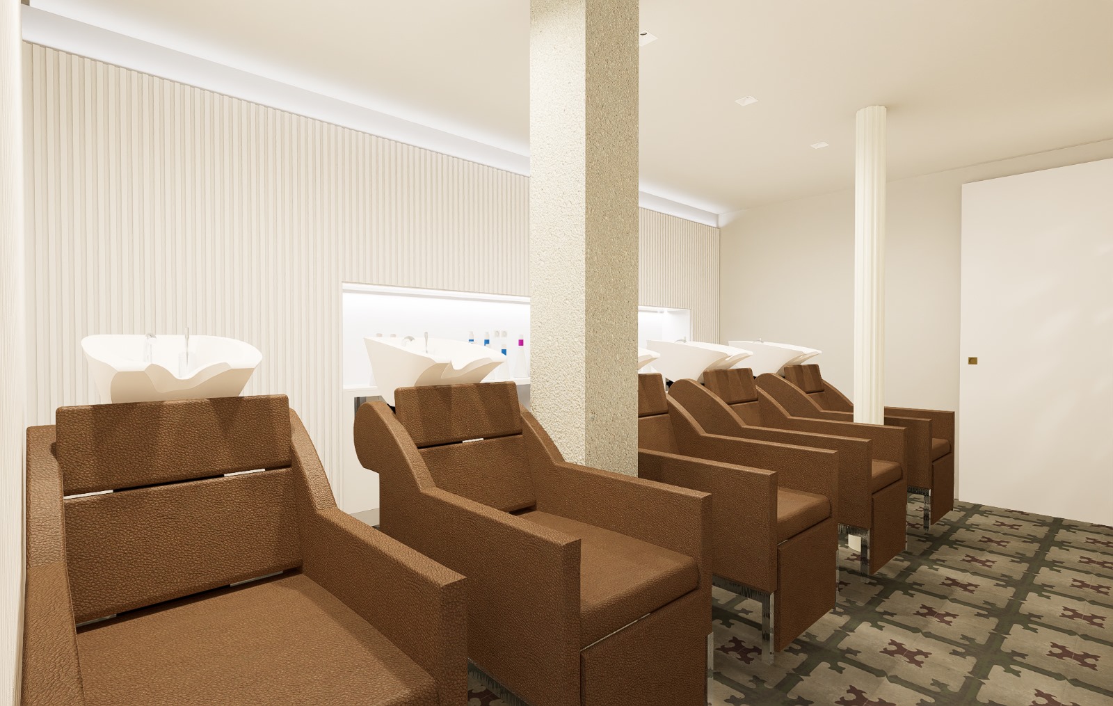 Renders 3D de la reforma de la nueva peluquería de lujo YÖY en el centro de Madrid.